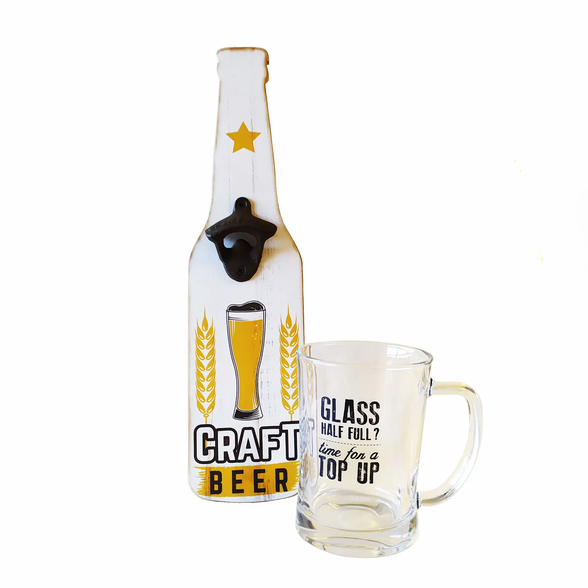 Material destapador: madera impresa Material jarra cerveza: vidrio impreso